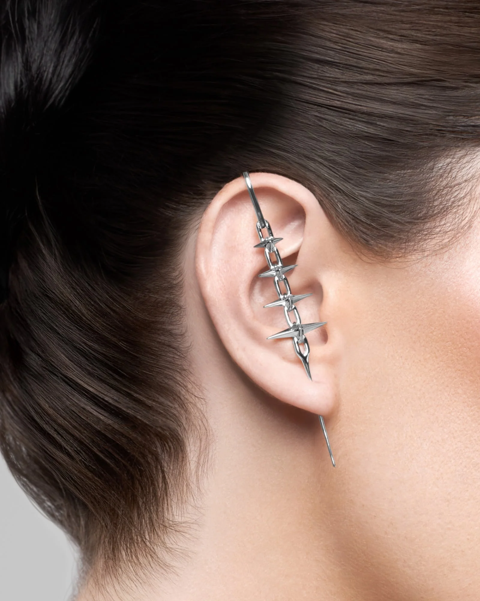 A 925 sterling silver pin cuff earring featuring bound links and tapered spikes. Designed to thread through your lobe piercing and clasp over your helix. Adjustable with care—gently bend the cuff to loosen or tighten the fit over your helix. Avoid repeated adjustments to preserve its durability. Features mirrored details and can be worn interchangeably on either ear. Made for all genders and expressions. Complete your look with other jewelry from the FORBIDDEN series.