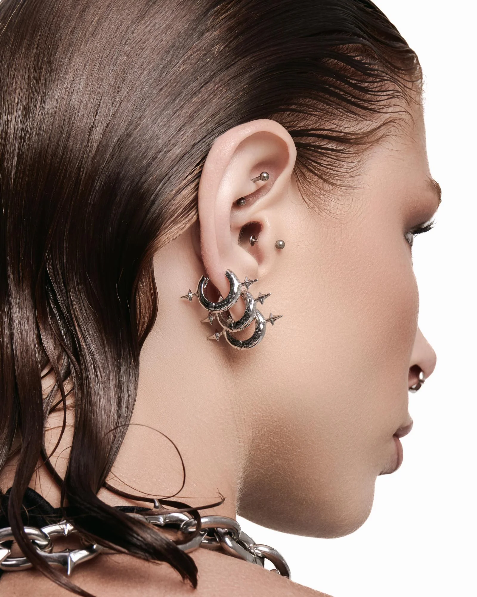 High-polished hoop earrings featuring twin opposing spindled spikes. Forged entirely from 316L surgical grade stainless steel for all genders and expressions. Complete your look with other jewelry from the GENESIS series.