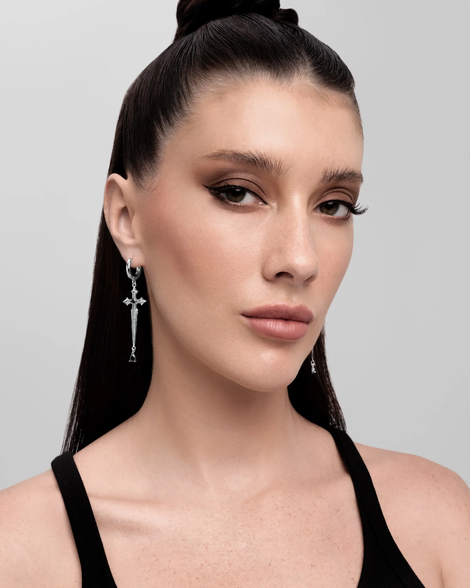 Embellished, demi-fine sword earrings with black crystal gem accents and hilts forming pointed gothic crosses. Made of 925 sterling silver. Shop the Illyria series. Part of the Eternal Amour collection.