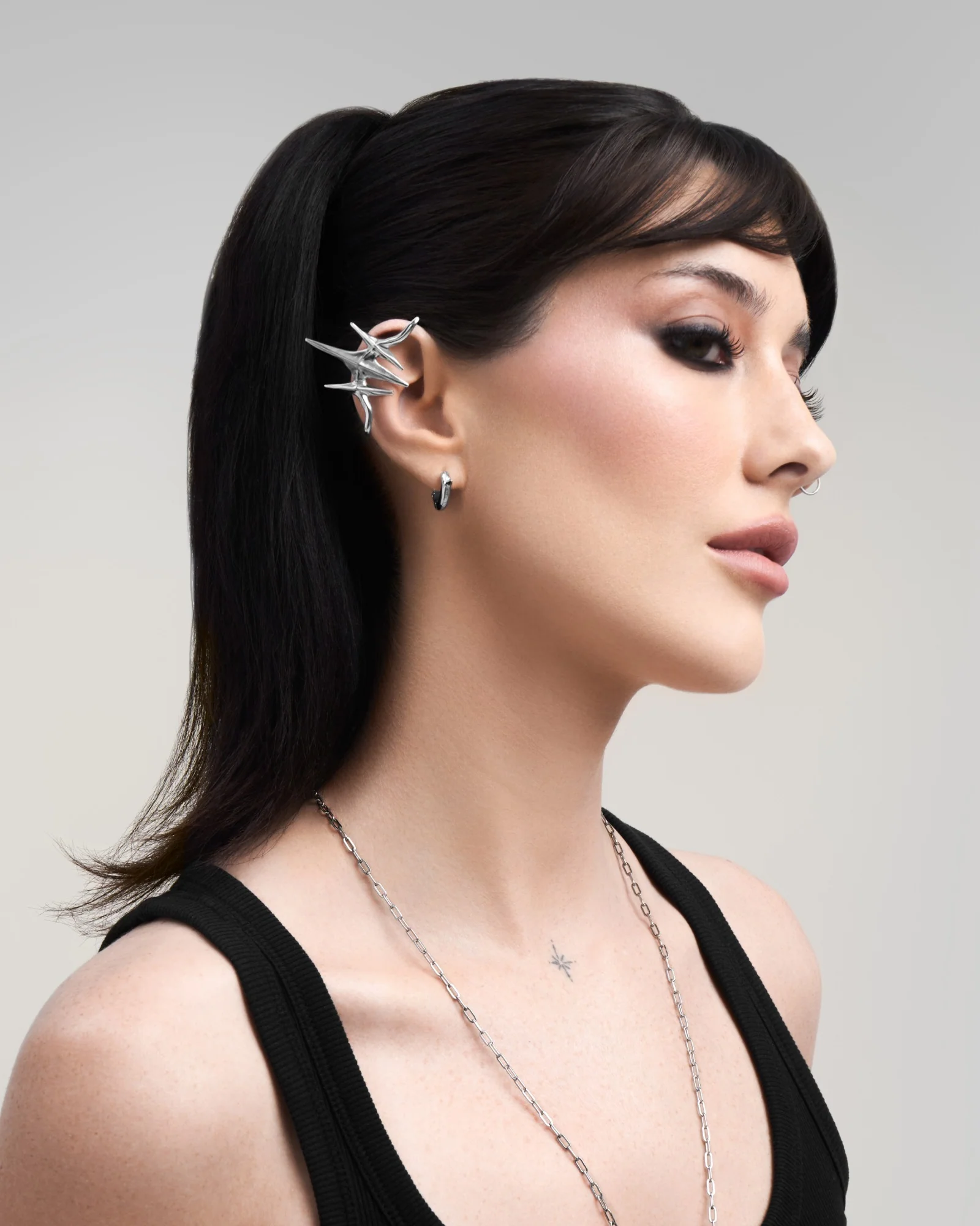 A demi-fine ear cuff featuring three, sculptural spindled spurs.  Forged from 925 sterling silver for all genders and expressions. Features adjustable sizing—bend gently for a custom fit. Each cuff features mirrored details on both sides and can be worn interchangeably on left and right helixes, and flipped to face up or point down. Complete your look with other jewelry from the ORIGINAL SIN series.