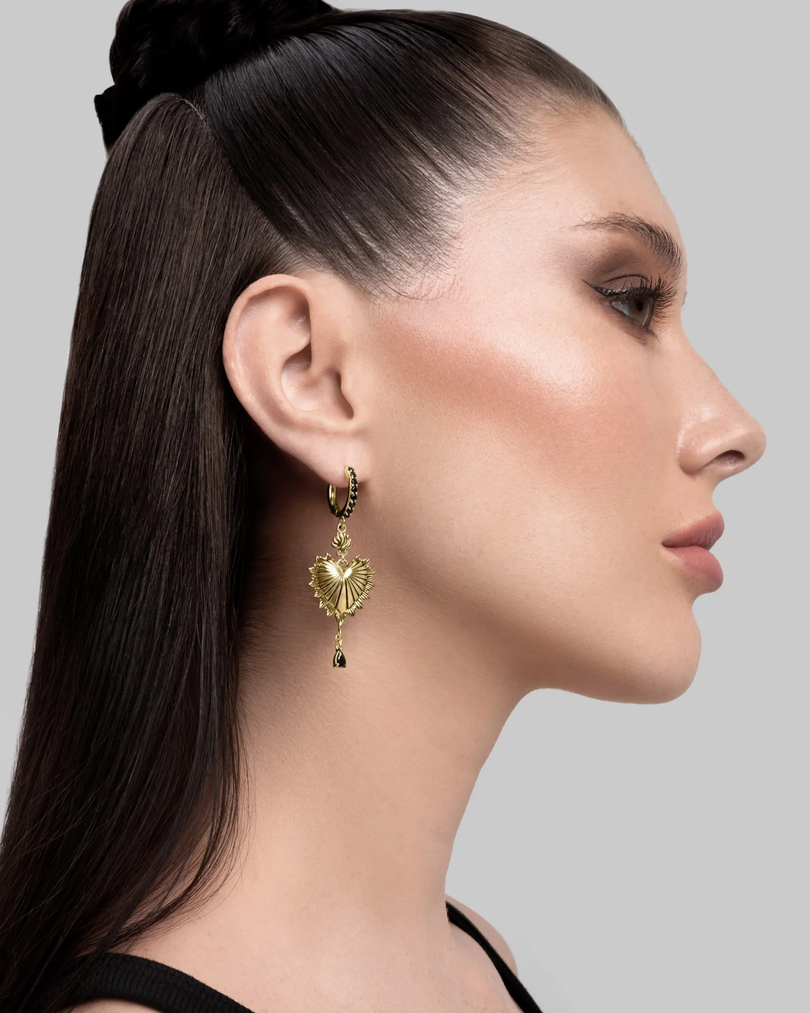 Demi-fine, embellished dangle earrings featuring our iconic sacred heart anchored by an ebony gem. Made of 925 sterling silver. Shop The Sacrament series. Part of the Eternal Amour collection.