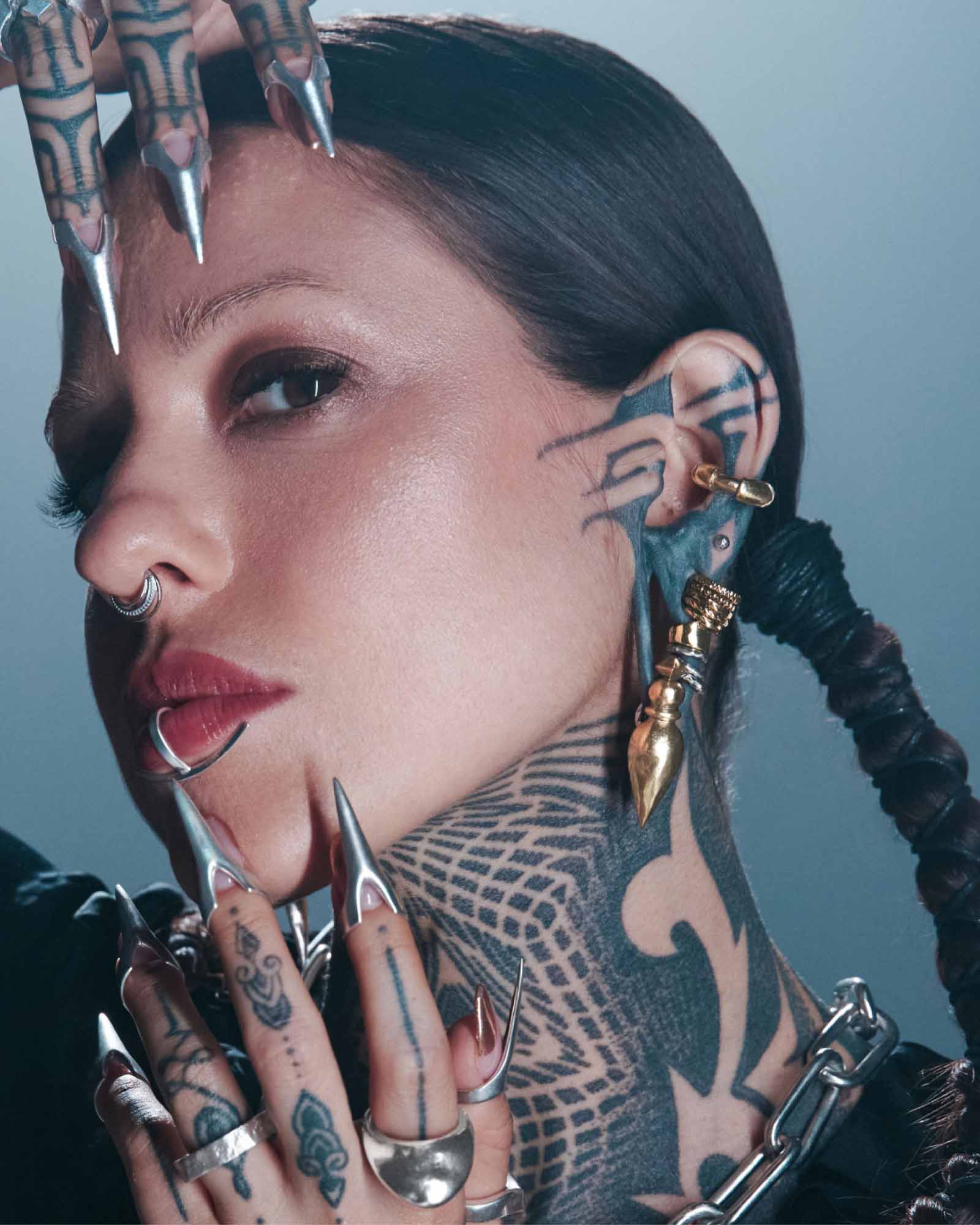 A high-polished, semi-circular ear cuff made from 925 sterling silver adorned with asymmetrical banded notches. No piercing required. Forged for all genders and expressions.